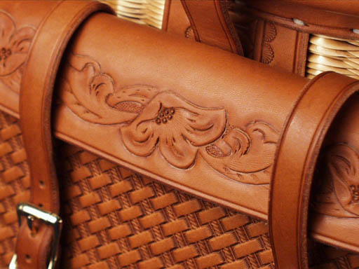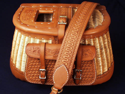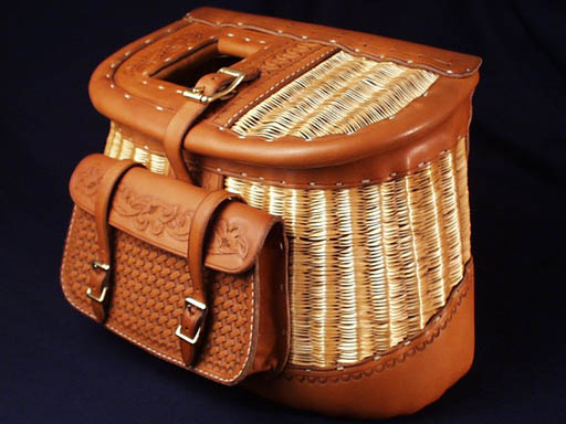 George Simeonov handcrafted leather fishing creel with front pocket and matching harness Description: George Simeonov is making a name for himself in the creel collecting community. He is known for his highly detailed, all hand-worked leather creels. This basket shows his talent at its best. And there's an innovation that makes it even more special. Finished just last week, this creel is based on a size #3 French weave Japanese basket, probably from the 1940's. It is in excellent condition with no breaks or gaps. The wicker is a beautiful light honey-oak. Top grade tanned cowhide in a natural finish. All hand detail, no machinery used. Beautiful half leather lid with intricate floral motif and inch scale. Front pocket with matching floral motif and weave pattern, and two adjustable closure straps. Everything hand stitched with premium waxed linen thread. All solid brass snaps, buckles and harness rings. Matching detailed leather harness included. As always, his solid copper acid-etched nameplate guarantees authenticity. You'll see the care and craftsmanship George put into this creel in the close-up photos below. Be sure to study the fine detail and the exceptional workmanship. George uses the best leather working tools in the world permitting, arguably, the sharpest detail in handcrafted leather creels today. This creel brings with it a new level of artistry, taking its place as another modern day classic. The innovation I spoke of earlier is in the way he has hidden snaps behind the buckles on the front pocket straps. You can quickly unsnap the straps to access the pocket., yet the straps are still fully adjustable with the buckles. The genius is in the simplicity of the design. A classic George Simeonov touch and unique to his creels. (shown in photo below) Another interesting touch that George added to this basket is the short buckle post. Most buckle posts are long and put stress on the buckle strap when opening or closing. That's why you see so many broken straps on old creels. These work just right. They hold tight, yet release easy. (shown in photo below) This is a unique opportunity to own a George Simeonov handcrafted creel. Perhaps some of you had the opportunity to see the creel that George allowed me to offer last month on eBay (see: previous creel) that one sold for $3050. This creel is even more desirable because of the front pocket design, extensive handcrafting on the pocket and lid, and his buckle snap innovation. A special creel that belongs in a special collection. Reserve price is $2500. Good luck bidding. |